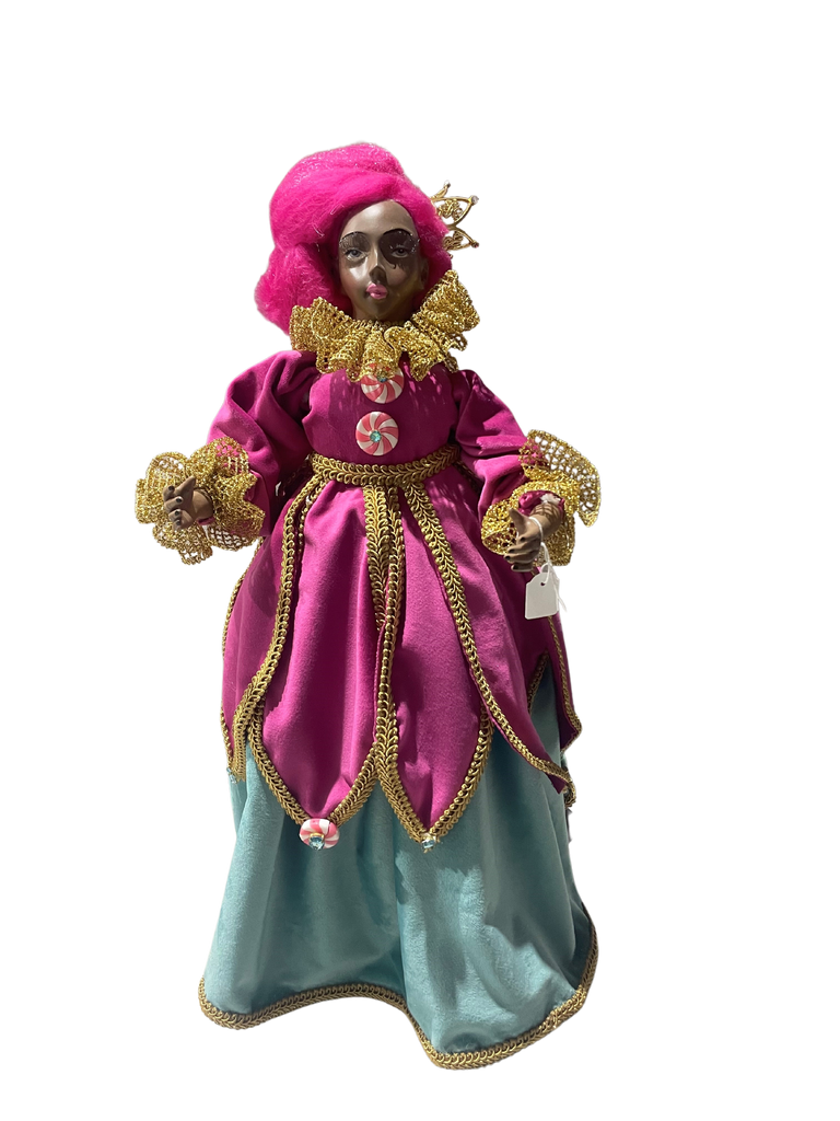 Indulge in the exquisite artistry of our individually handcrafted collectable - Our Gum Drops Lady. She is a one off and comes with a certificate of authenticity and features delicate French paint, Marino wool hair, and glittering Swarovski crystals.